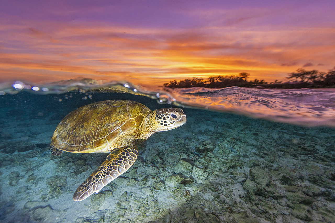 Turtle over a shallow reef at sunset, Lady Elliot Island