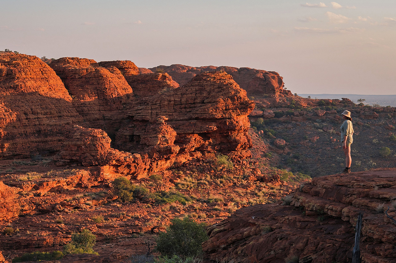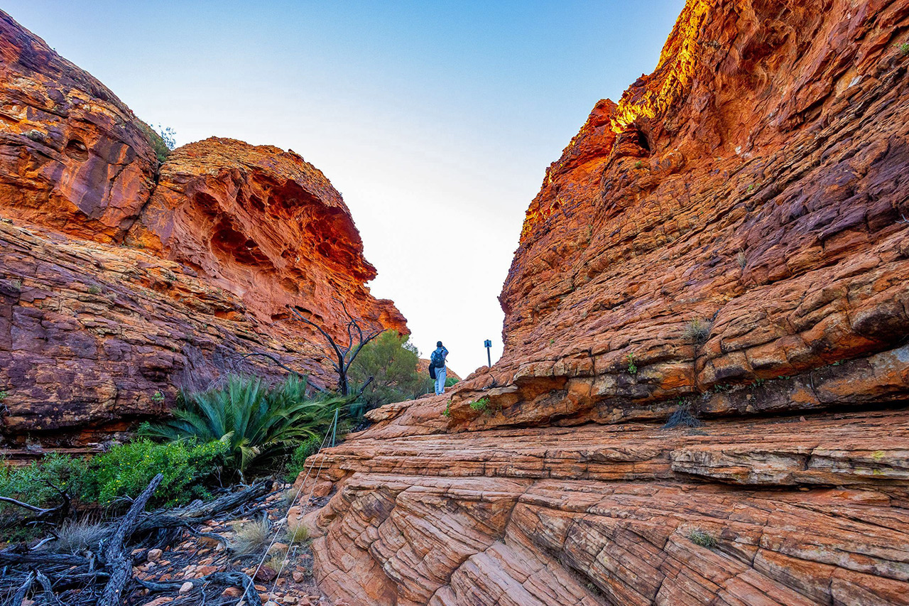 Feel on top of the world as you walk along the towering red rock cliffs of Kings Canyon and take in views of the forest of palms below. Watarrka National Park is only three hours’ drive from Uluru, and is home to the mighty Kings Canyon – a majestic destination featuring 300m high sandstone walls, palm-filled crevices, and views that stretch across the desert. More than just a day trip destination, Watarrka National Park has a range of walking trails, 4×4 tracks, camel tours and accommodation options ranging from camping to resort-style rooms.